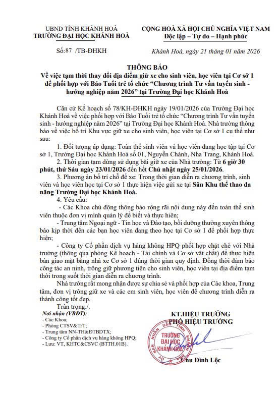 Thông báo về việc tạm thời thay đổi địa điểm giữ xe cho sinh viên, học viên tại Cơ sở 1 để phối hợp Báo Tuổi trẻ tổ chức "Chương trình Tư vấn tuyển sinh - hướng nghiệp năm 2026" tại Trường Đại học Khánh Hòa